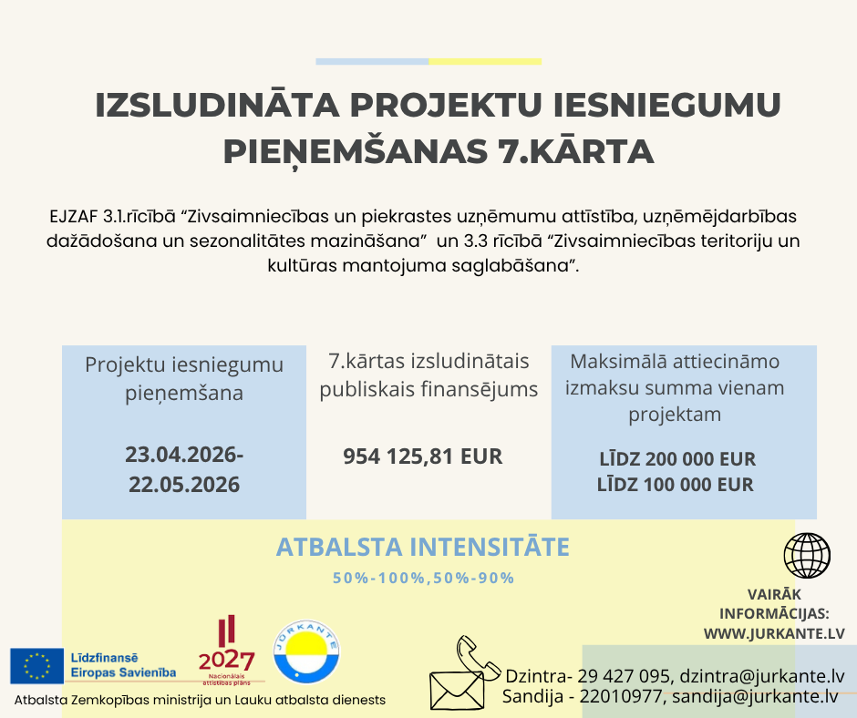Vietējās rīcības grupas (VRG) kontaktinformācija: www.jurkante.lv; dzintra@jurkante.lv